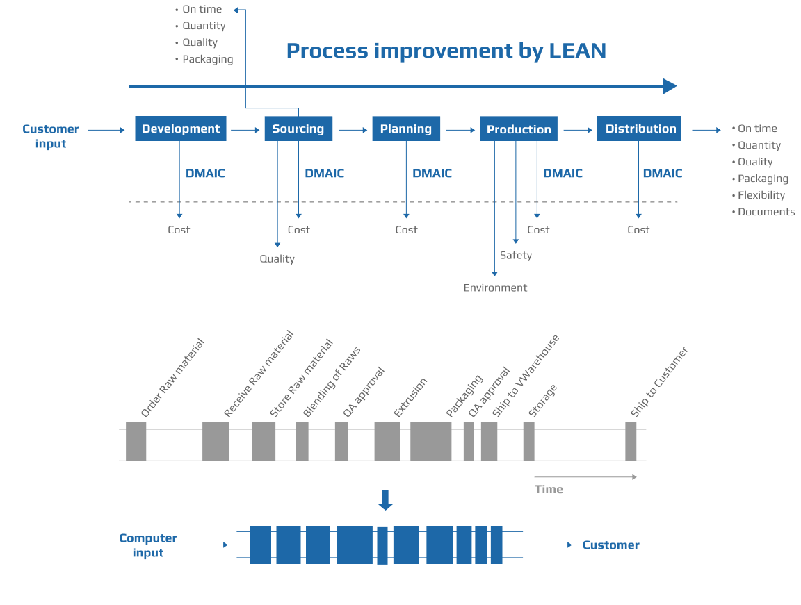 Lean Six Sigma is a process improvement strategy that seeks to eliminate inefficiencies in a company's process flow by identifying the causes of waste or redundancy and developing solutions to address them.